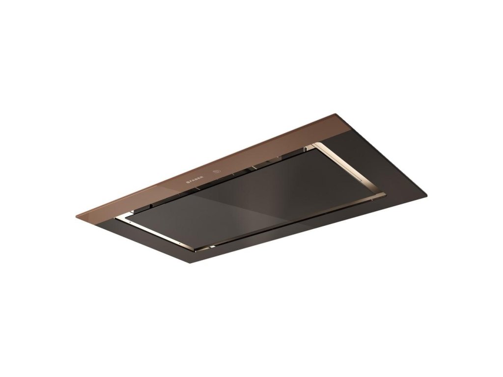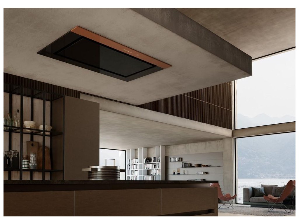 Luxusní stropní odsavač par C-AIR v netradiční kombinaci černého skla RAL 9005 a světle hnědého skla RAL 8025 byl konstruován s důrazem na nápadité detaily podle posledních trendů, přesto však tak, aby nenarušil čistou linii kuchyně.