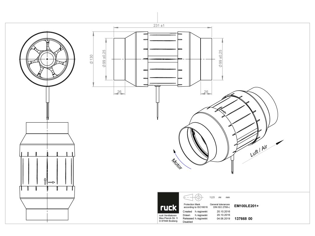 Ventilátory jsou určeny pro dopravu vzduchu o teplotě až 60 °C, s elektrickým krytím IPX4 a izolací motoru třídy F.