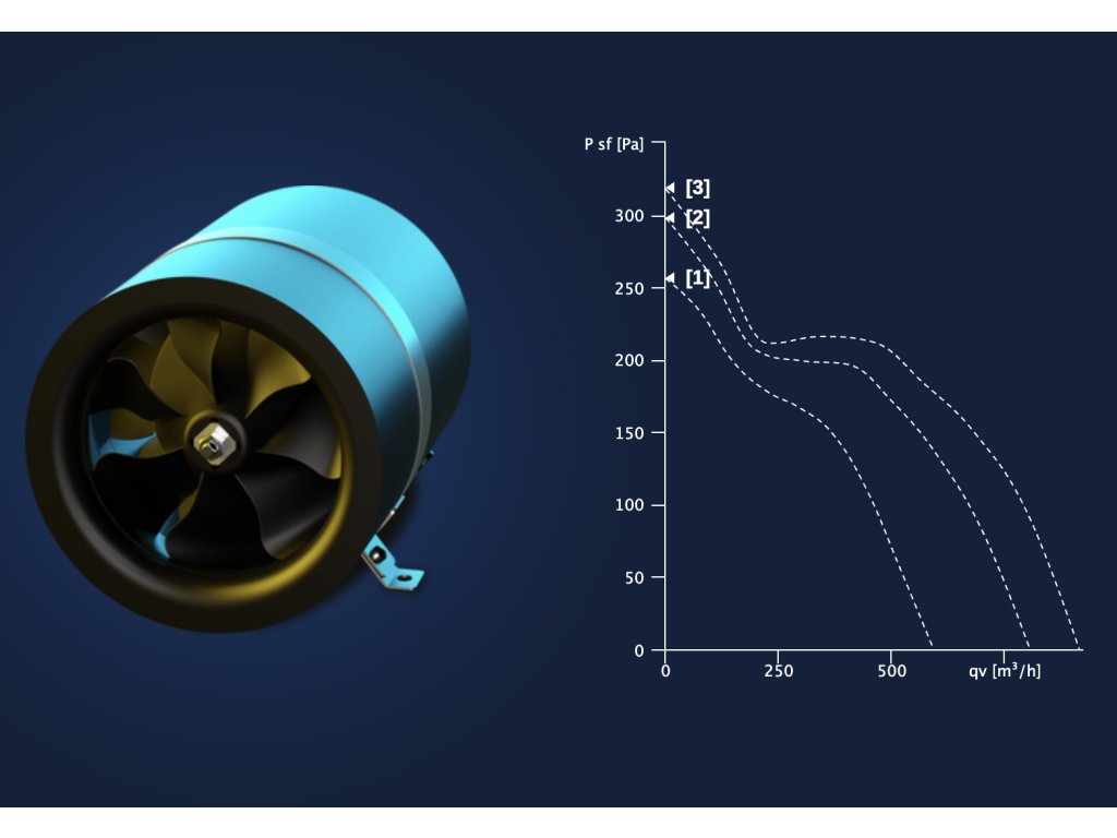 - EC motor (elektronicky komutovaný) – až o 50 % úspornější, tišší a s možností plynulé regulace výkonu (0–10 V). Vhodný pro trvalý provoz a systémy s požadavkem na nízkou hlučnost.