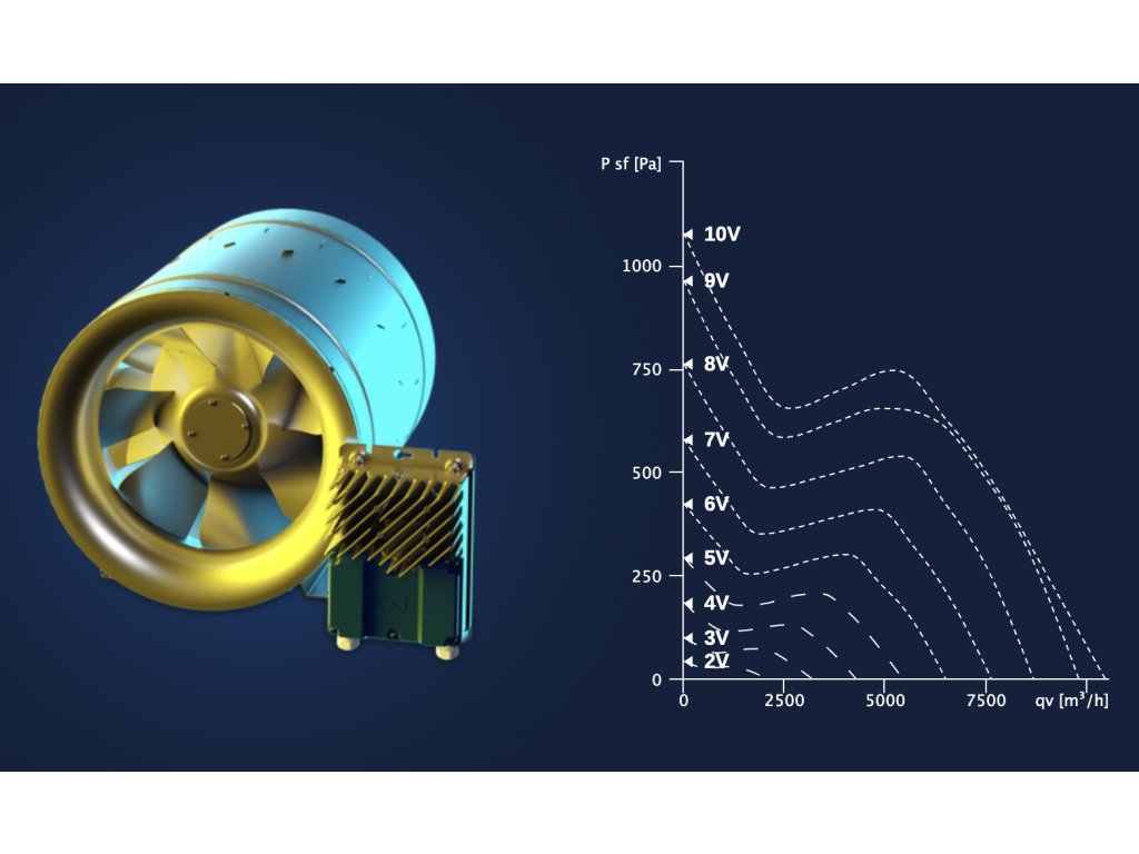 - EC motor (elektronicky komutovaný) – až o 50 % úspornější, tišší a s možností plynulé regulace výkonu (0–10 V). Vhodný pro trvalý provoz a systémy s požadavkem na nízkou hlučnost.