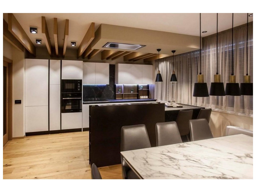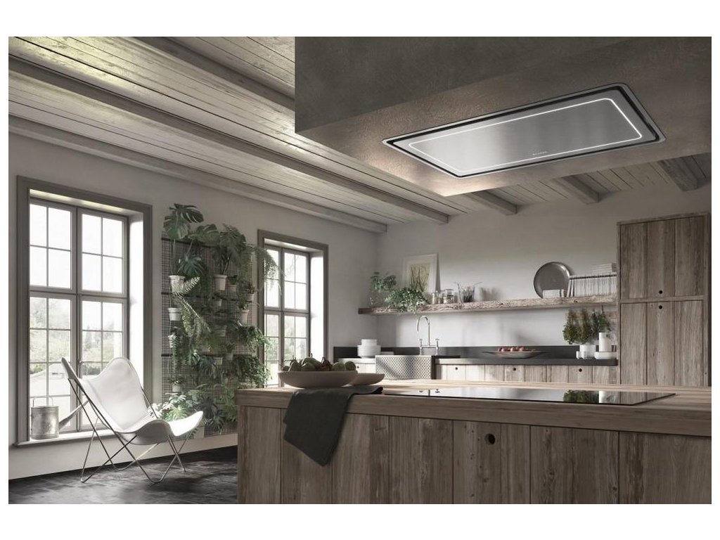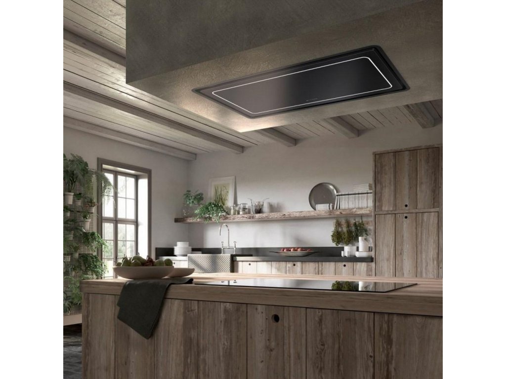 Odsavač v matně černém provedení se stane přirozenou součástí vaší kuchyně, neruší výhled při vaření a je vhodný především do větších prostor, které vzniknou spojením kuchyně s obývacím pokojem.