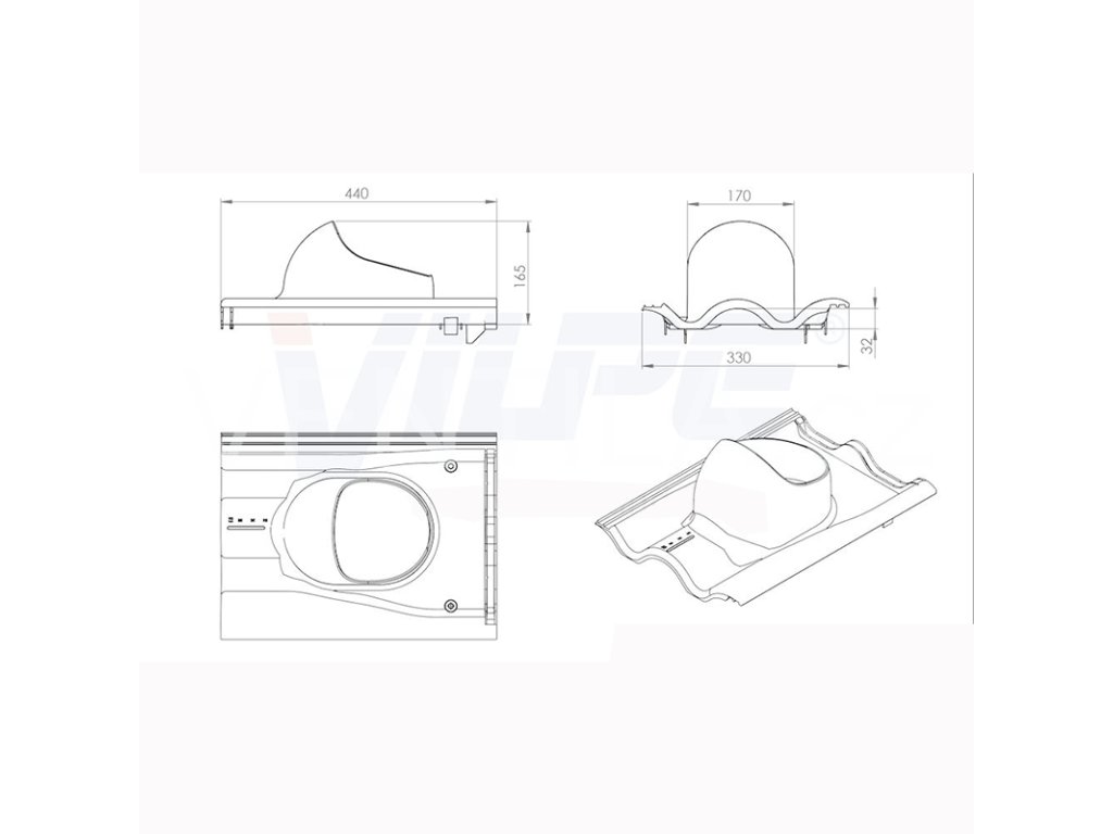 Použití: Průchodový prvek nahrazuje jednu tašku šířky 330 mm s výškou profilu 27–40 mm. Délka průchodového prvku je 440 mm.