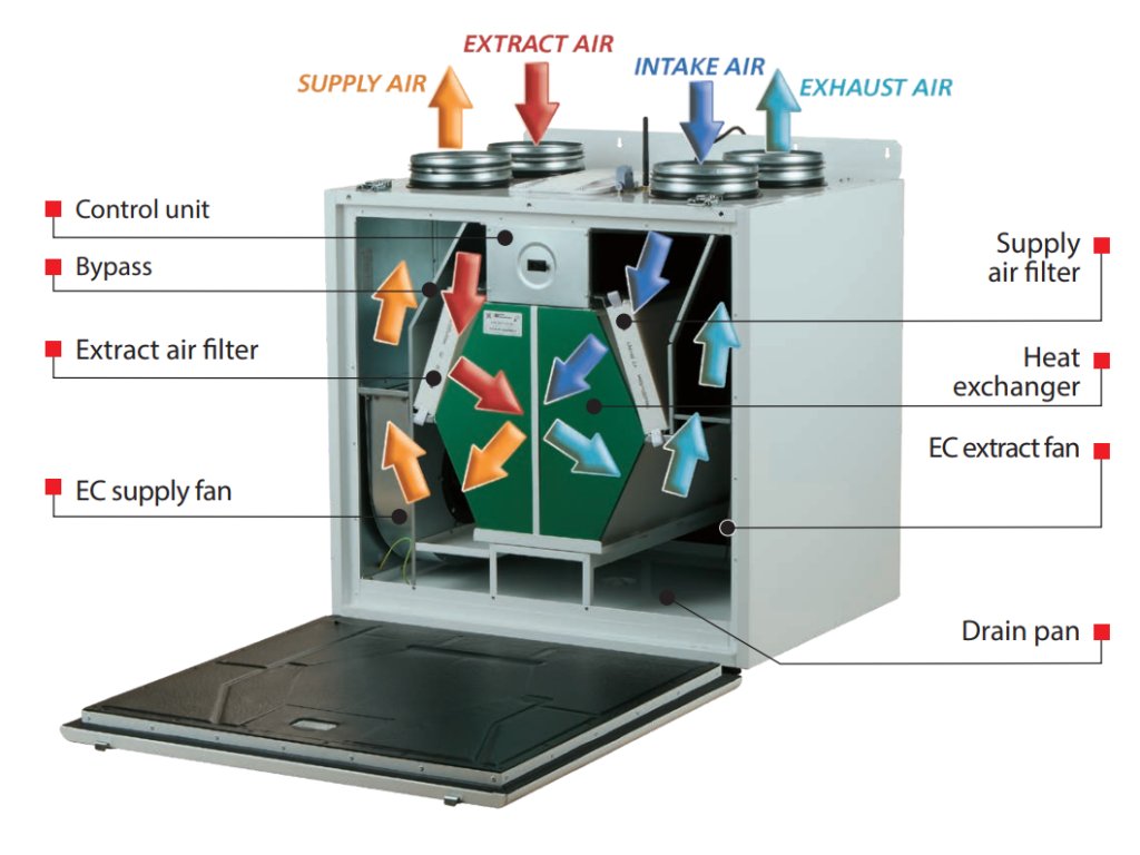 Vzduchotechnické jednotky jsou plně vybavené větrací jednotky s rekuperací tepla pro filtraci vzduchu, přívod čerstvého vzduchu