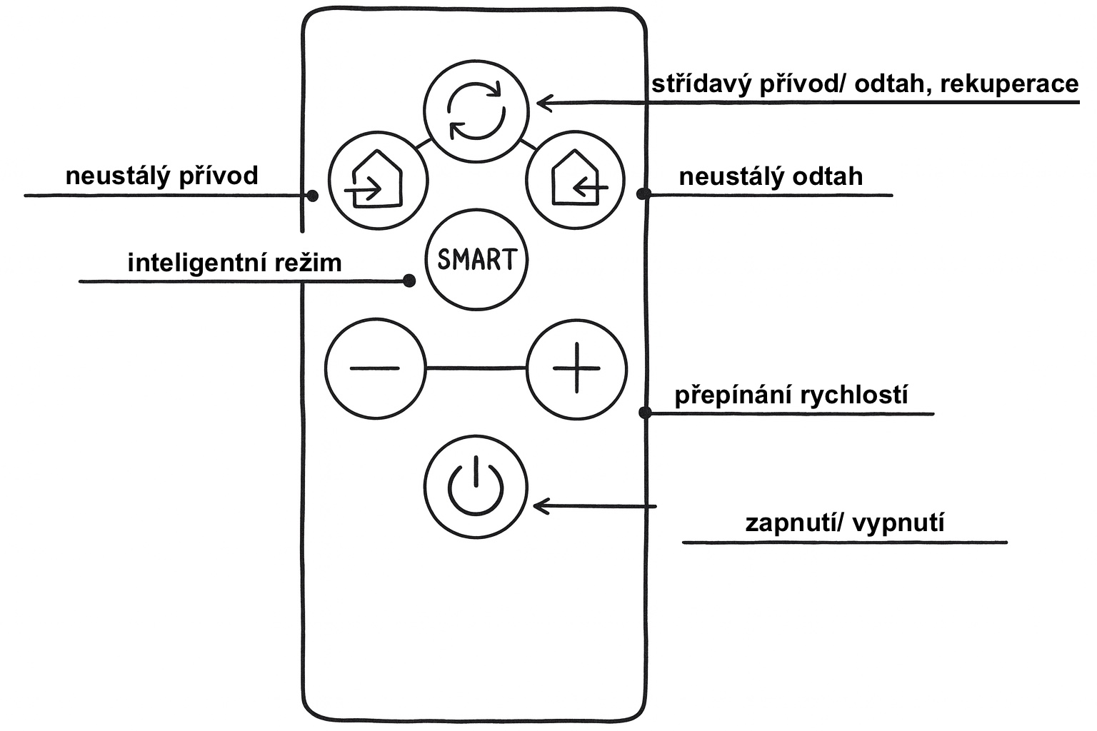 - přepínat mezi režimy přívod / odtah / rekuperace / SMART,