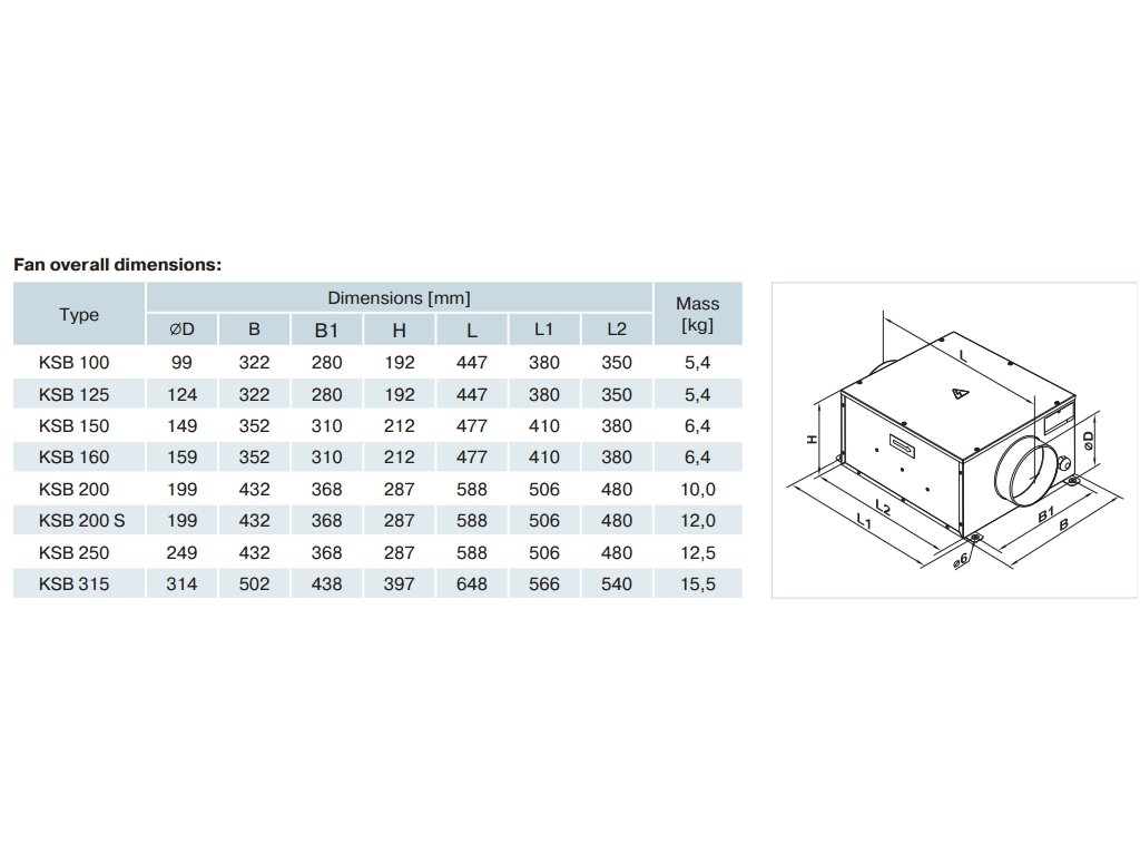 Ventilátor KSB je určený pro přívod nebo odvod vzduchu ventilačního systému s vysokým požadavkem na nízkou úroveň hluku a omezený montážní prostor. Zařízení přizpůsobeno pro instalaci do podhledu. Napojení ke kruhovému potrubí.