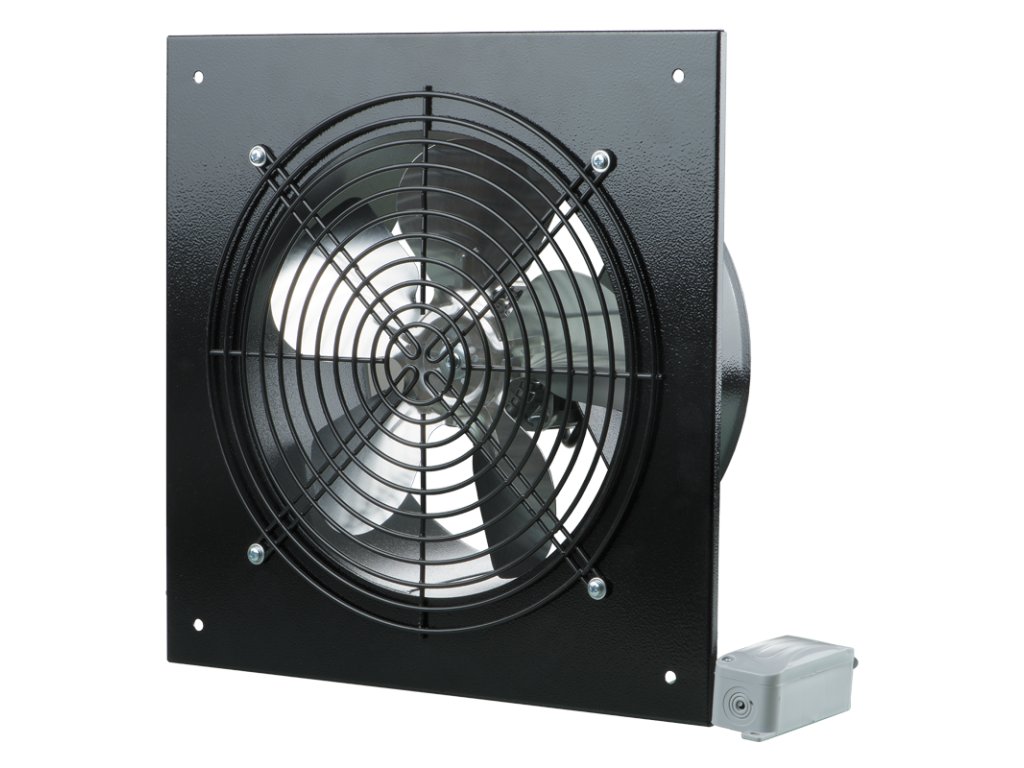 Nízkotlaké axiální ventilátory v ocelovém pouzdře pro montáž na stěnu.