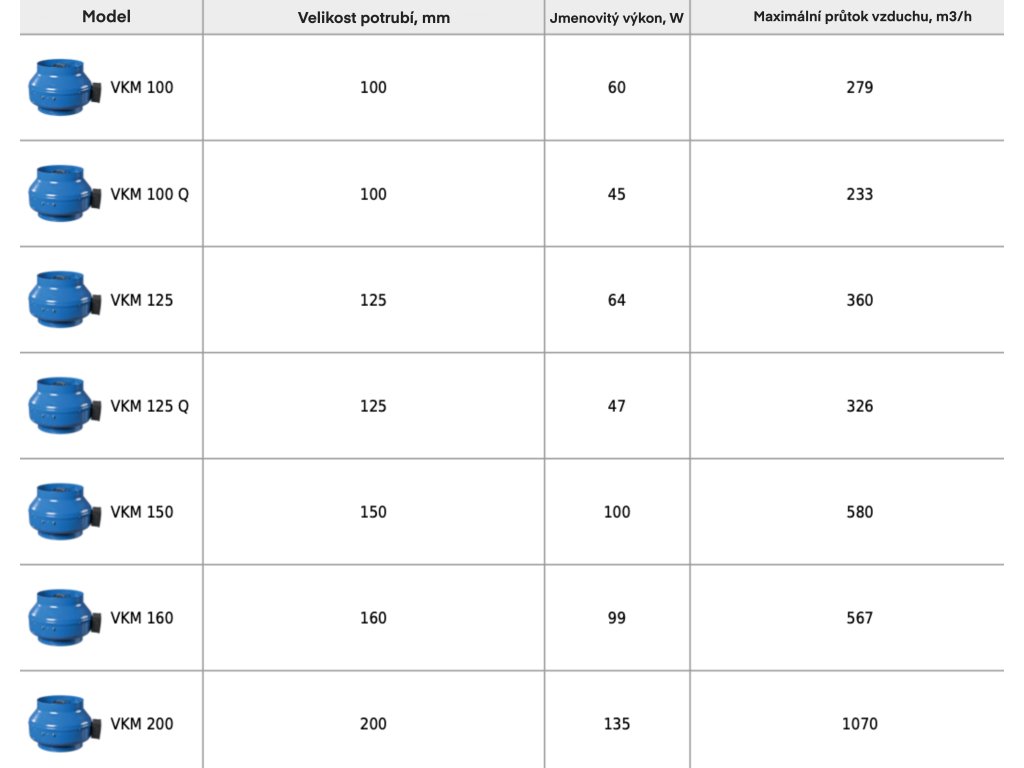 Ventilátor je k dispozici v provedení pro různé velikosti potrubí: